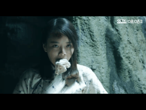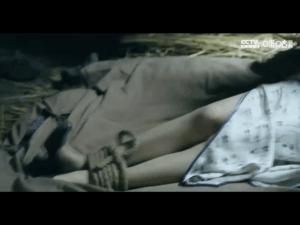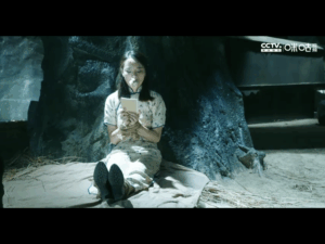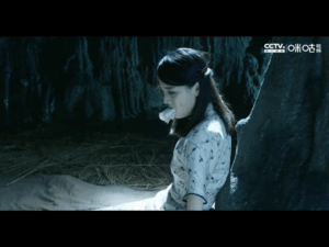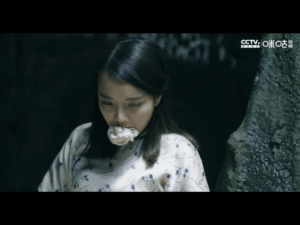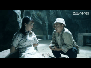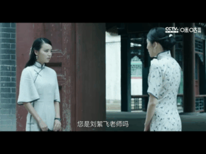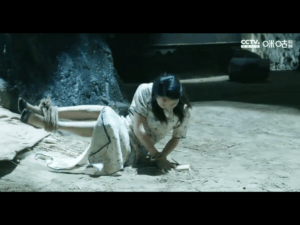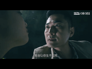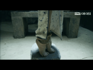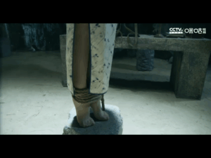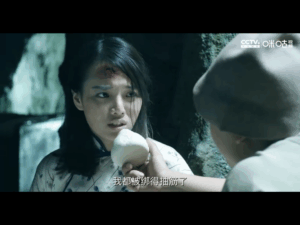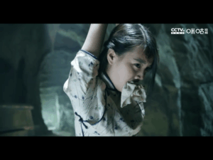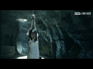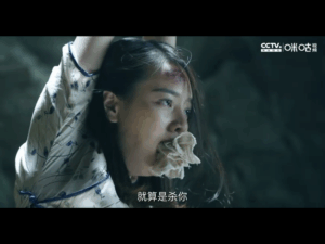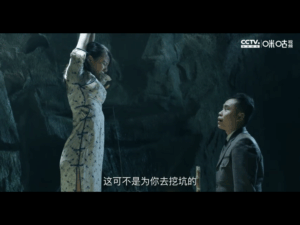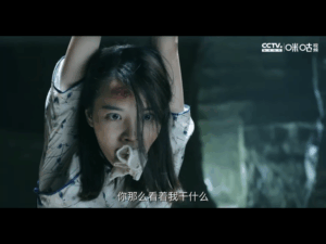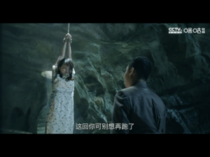 本剧背景是民国时期,丁香紫饰演的刘絮飞是一名女教师,也是一位已婚少妇。这名角色在26集才初次登场,而在之后的故事中戏份不少。28集中,一身旗袍丝袜高跟鞋装扮的女教师被坏人骗走绑架藏了起来,她万万没想到,这次绑架居然是自己丈夫宋彪授意的,而丈夫真实身份竟然是日本黑杀帮成员,对她并无真感。从28集一直到42集结局,剧情中这位悲催的女教师基本都是一直被绑着手脚囚禁在山洞里,大概可以竞争影视剧中被绑时间跨度最长的角色之一吧!35集中,由于刘絮飞尝试逃跑失败被抓,在二次捆绑时为了惩罚她,坏人将其双手吊了起来并脱掉鞋子,让她只能用丝袜脚尖刚好踩在一块大石头上。这个片段可以说是国产丝足DID的极品了,虽然时间不长,但丝足特写长达数秒,旗袍+丝袜+踮脚的组合,不仅使女演员的身材凹凸有致,弯曲绷紧的丝足和旗袍开缝下若隐若现的丝腿(甚至还能看到一点白色内裤的边)也有种朦胧美。这种吊绑踮脚的桥段在其他影视作品中也出现过,大多是勒颈吊绑+踮脚,受害人为了避免窒息不得不一直用力踮着脚尖,非常残酷(时间一长脚趾出汗还可能变得更滑而增大生存难度,脱力的时候基本就要玩完了),而本段是吊手绑,女教师没有性命之忧,但为了不让双手手腕承受过多的伤害,也不得不在大部分时间踮脚,虽淡化了残酷色彩,但也暗示了这样的惩罚会持续较长的时间。如果说本人心目中丝足DID片段的头名是《13号星期五》的勒颈吊绑,那么本段至少可以竞争一下国产丝足DID片段的头名,唯一遗憾的就是特写镜头如果再长点就好了。